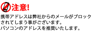 ご注文・お問合せの際にご利用するメールアドレスが携帯電話アドレスの場合はブロック規制を必ず解除しておいてください。(ezwebは特に受信できない可能性が高いです。ドコモは受信拒否設定されている場合が多いです。